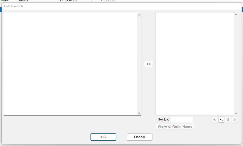 - Once a Note has been highlighted within the Add Claim Note Window, click the << button to move it from right pane to left pane, and then click OK: