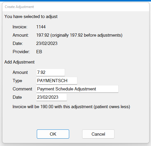 - Set the Date of the Adjustment, Adjustment Type and the Adjustment Amount, and then click OK: