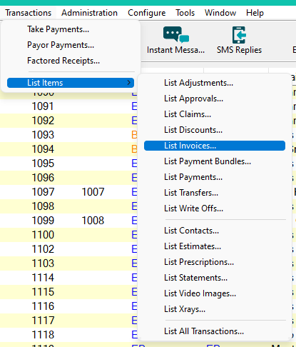 - Click Transactions > List Items > List Invoices
