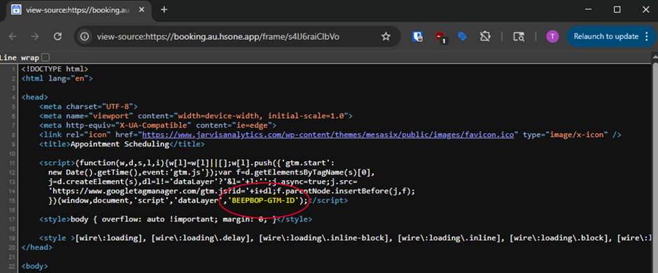 You can check that the GTM Container ID has been synchronised from EXACT by inspecting the source code of the online booking webpage.