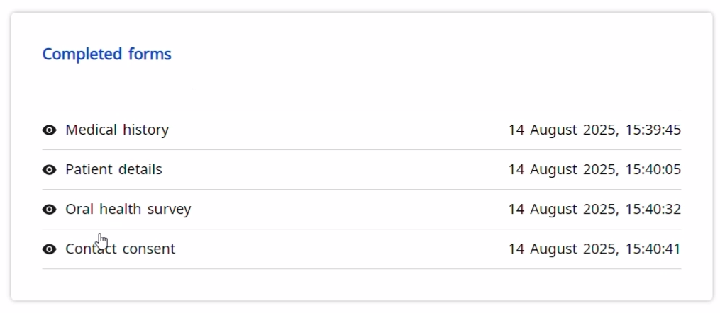 On the Home Page patients can view previously completed forms by selecting the form they wish to view. These forms will be at the bottom of the home page.
